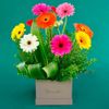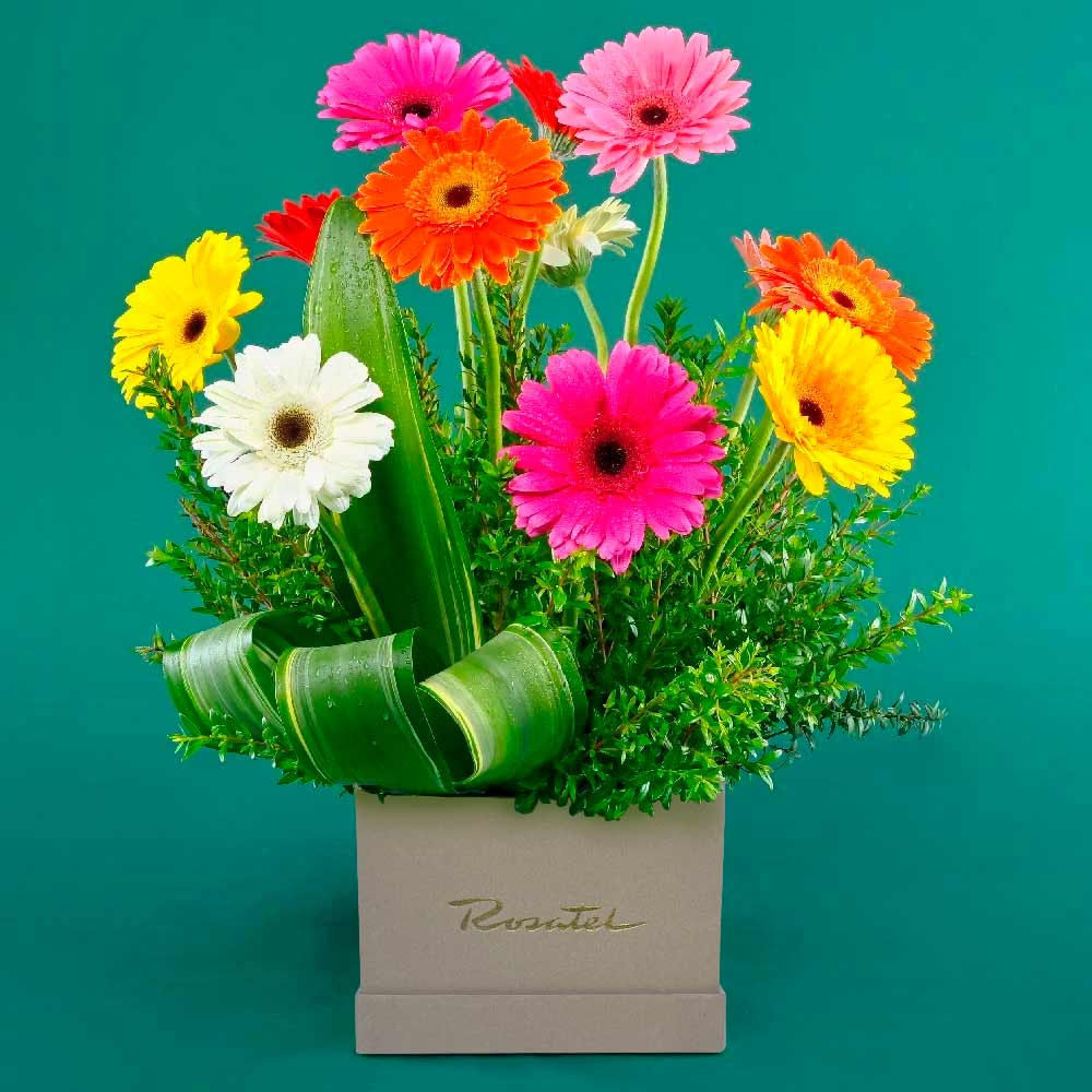Arreglo en sombrerera (18x18 cms. de ancho 14 cms de altura) con 12 gerberas inspirado en la primavera complementado con follaje que aporta un toque natural y armónico.