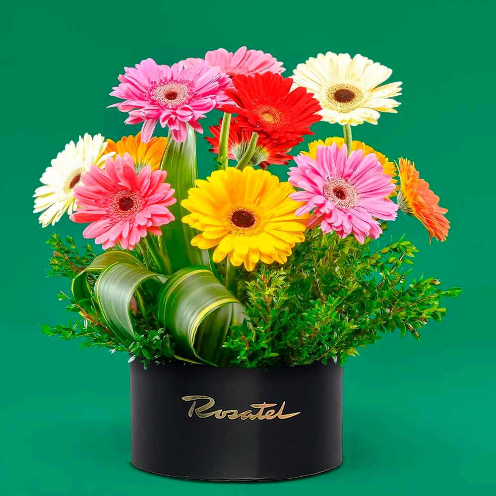 Elegante y colorido arreglo en sombrerera negra (Circunferencia 20 cms. Alto 12 cms.) compuesto por 12 gerberas en colores vibrantes que llenan de vida y alegría cualquier espacio. Acompañadas por un delicado follaje verde, estas flores crean una combinación fresca y armoniosa perfecta para iluminar cualquier ocasión especial.