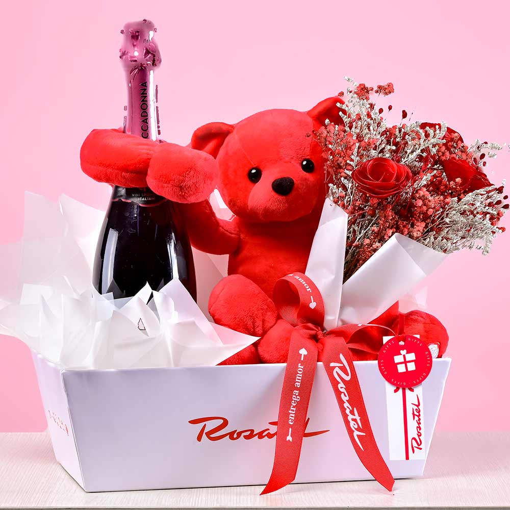 El arreglo se completa con un tierno peluche amoroso rojo de brazos largos (19 cms. sentado), que aporta un toque de dulzura y ternura, convirtiendo este regalo en una experiencia emotiva y memorable. Su cuidada presentación lo hace perfecto para expresar amor, cariño y gratitud.