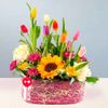 Esta alegre composición se completa con una selección de coloridas flores y un follaje variado, creando una armonía perfecta que ilumina cualquier espacio.