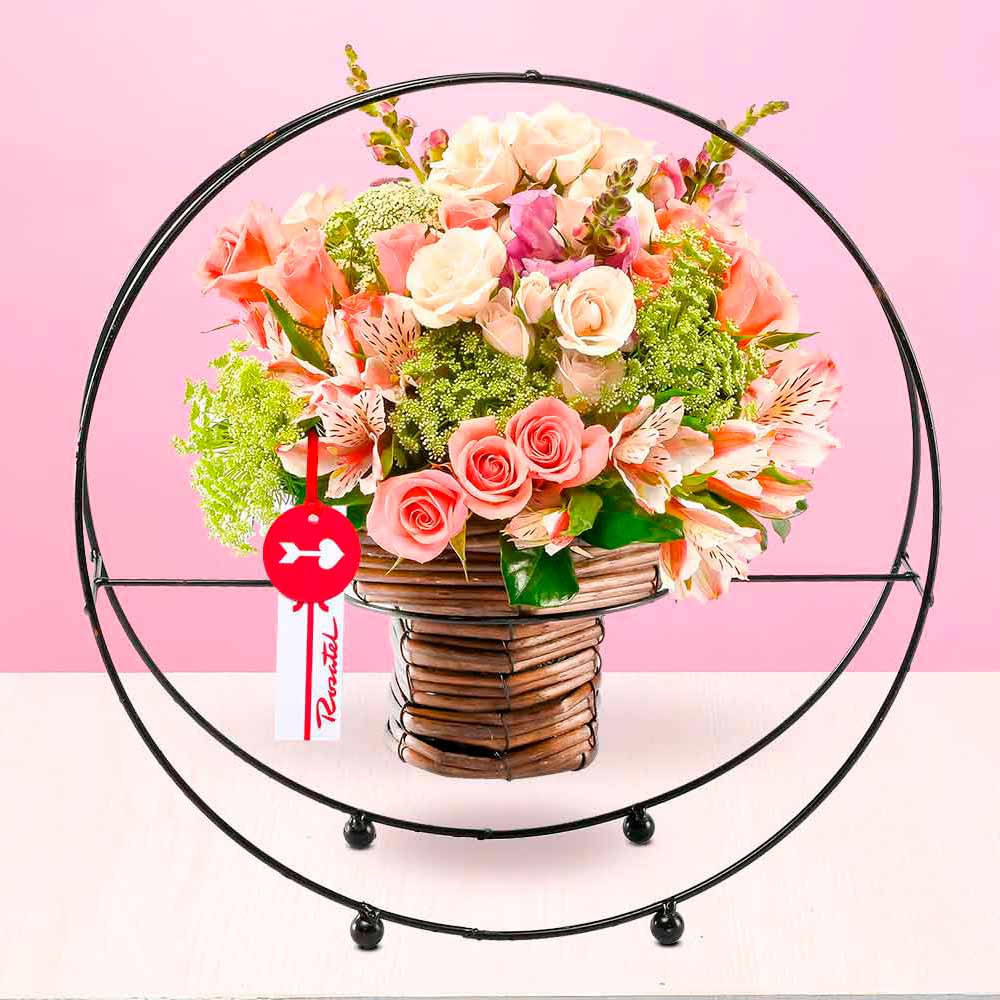 Delicado arreglo para celebrar cualquier ocasión, creado en canasta (10 cms.) diseño aro metálico, decorado con mini rosas en colores cremas y rosados, complementadas con flores y follaje variado dándole un toque suave y delicado al arreglo.