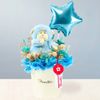 Celebra la dulce llegada del nuevo bebé con este lindo y delicado arreglo en sombrerera crema grande (20 cms.) con tierno peluche Chimpy monito celeste bebé (26 cms.) Aurora, decorado con mini rosas preservadas, follaje seco y globo estrella 9".