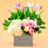 Creado con 9 rosas y 15 tulipanes en colores pasteles, hortensia y follaje en sombrerera (18x18 cms. de ancho 14 cms de altura).