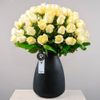 Delicado y elegante arreglo en base de vidrio negra (37 cms. alto aprox.) con 75 rosas cremas que representan la paz y el amor eterno.