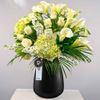 Base de vidrio negra (37 cms. alto aprox.) con 12 rosas cremas, 12 cartuchos, flores variadas en color blanco complementado con follaje variado.