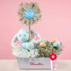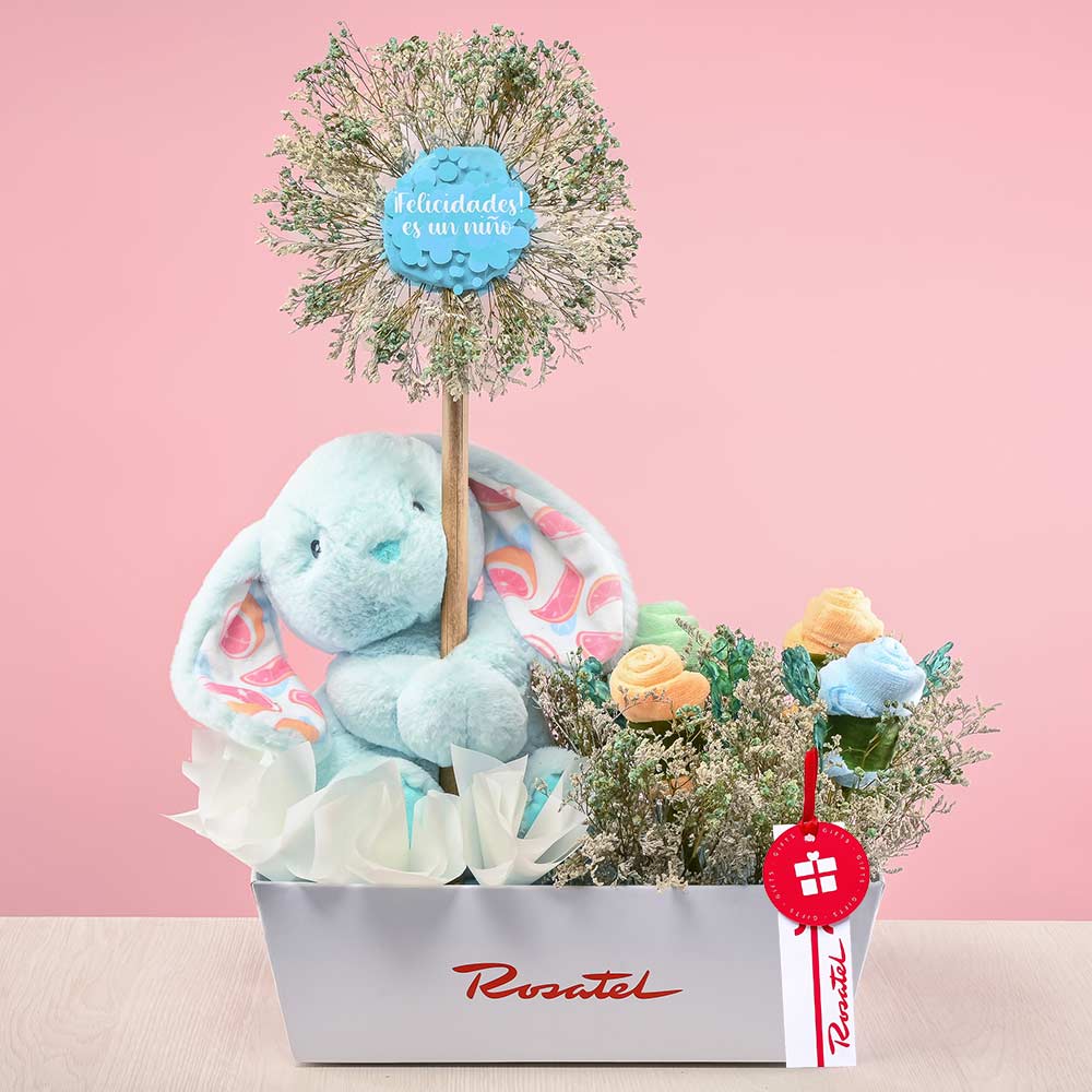 Delicado arreglo para celebrar la llegada del nuevo bebé. Tierno conejito de peluche Aurora Dewey color celeste (28 cms.), el compañero aventurero con un corazón tan grande como sus orejas en estilo Flourish, babitas de colores en forma de flores, decorado con flores secas y varilla felicidades es un niño.