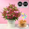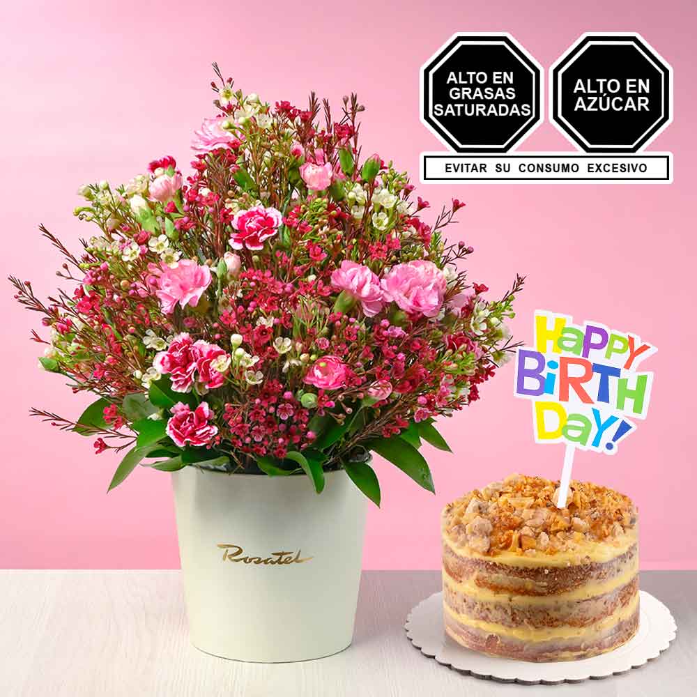 Entrega inmediata. Delicado arreglo diseñado con colores suaves, sombrerera crema mediana (15 cms) con clavelinos en tono rosa y lila, watts colores variados y follaje (40 cms. alto aprox.) acompañado con delicioso detalle para disfrutar en este día tan especial, mini torta de zanahoria rellena y decorada con frosting (14 cms. diámetro) decorada con vibrante varilla happy birthday.