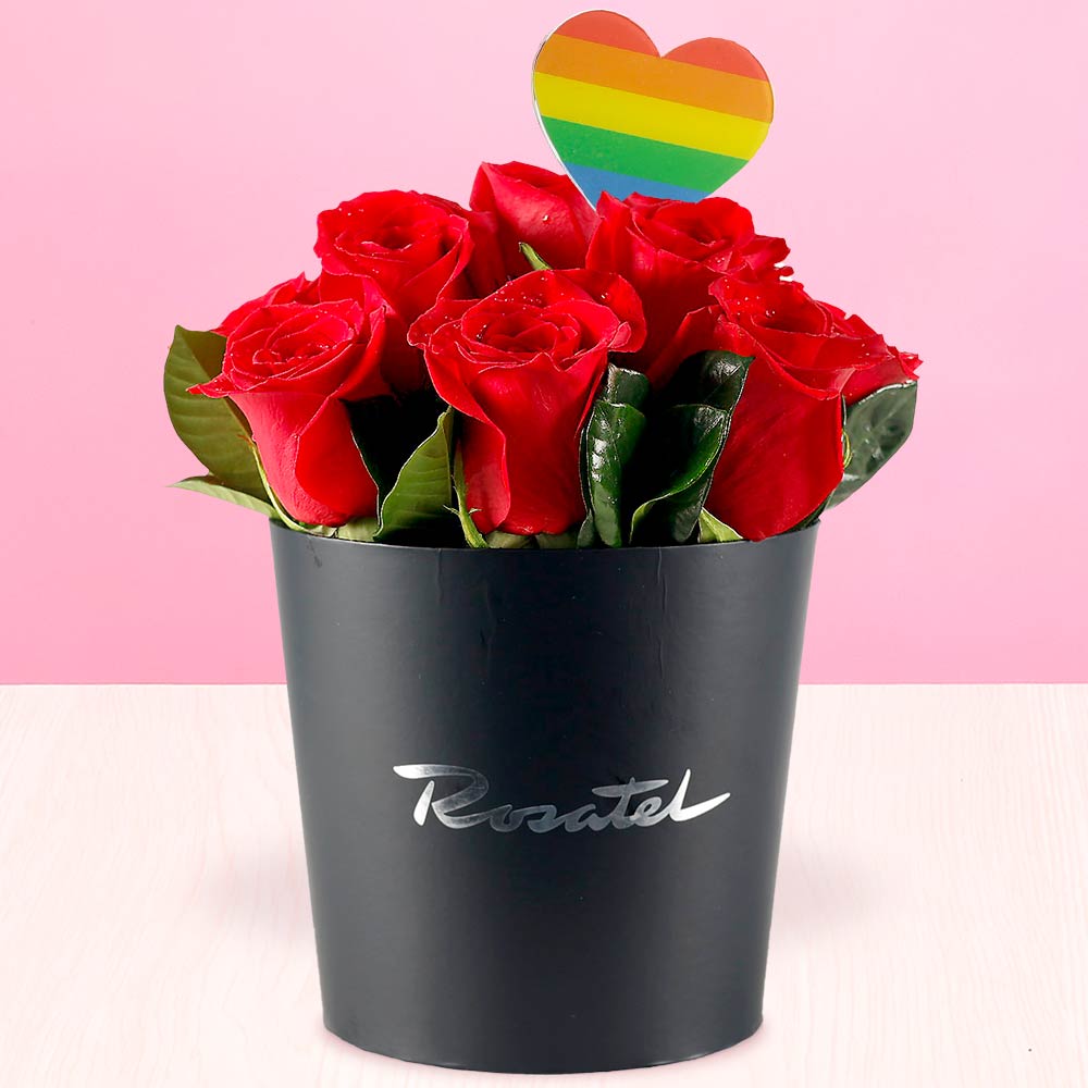 Arreglo de Rosas Rojas y Corazón Arcoíris
