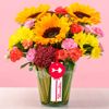 Colorido y vibrante para esta temporada, sorprende con este arreglo diseñado en florero de vidrio (15.5 cms.) con 3 girasoles, flores variadas y follaje.