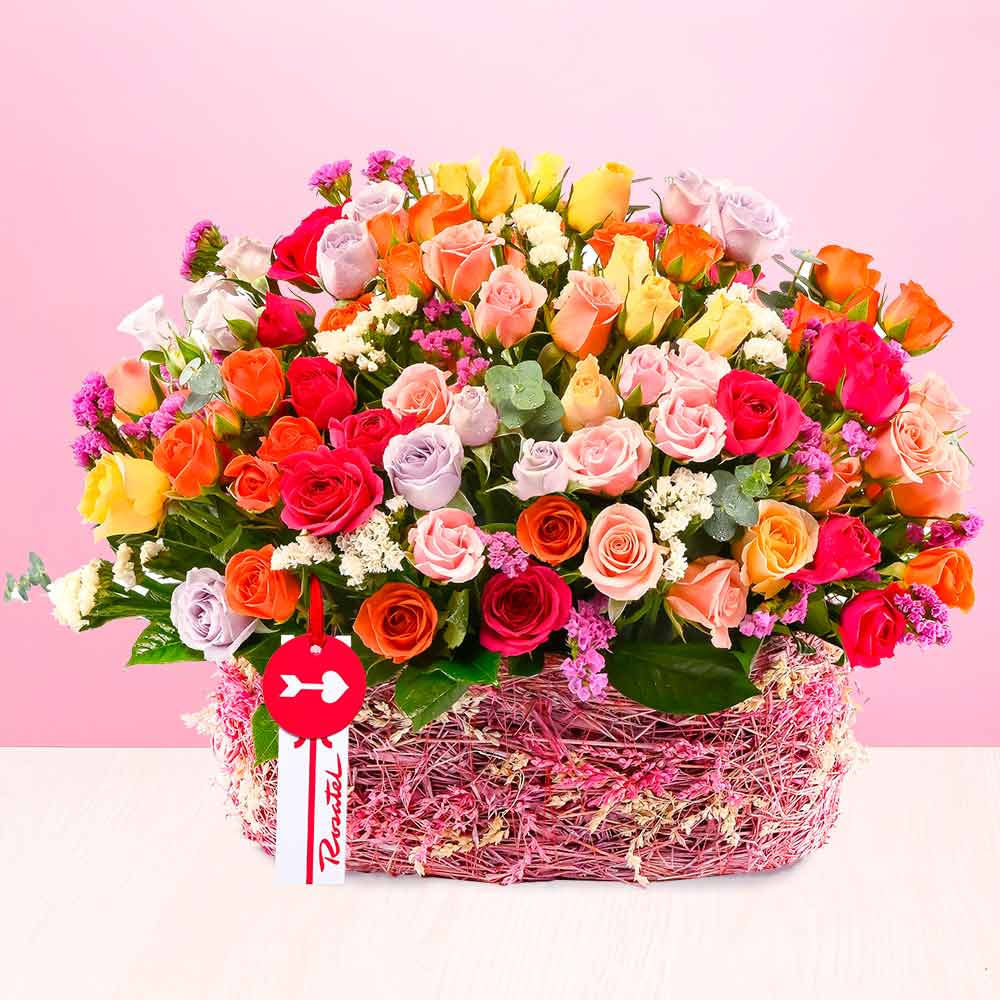 Sumérgete en la frescura de la primavera con nuestro encantador arreglo presentado en una delicada canasta de un suave tono rosado (12 cms. de largo x 17 cms. de ancho), este arreglo resplandece con una explosión de mini rosas en una paleta de colores vibrantes. Cada una, cuidadosamente seleccionada, aporta su propia personalidad al conjunto, creando un festín visual que evoca la alegría de la temporada.