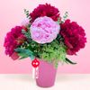 35 cms. alto aprox. Celebra los momentos más especiales con este arreglo en base de vidrio rosada (15.5 cms.), cuidadosamente diseñado con 3 peonías rojas y 3 peonías rosadas, acompañadas de una variedad de flores frescas que realzan su encanto y elegancia.