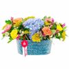 Delicado arreglo floral primaveral diseñado con flores variadas, hortensias, complementado con follaje en base metálica vintage con delicado diseño en color azul (12 x 28.5 cms.) que añade un toque de distinción y nostalgia.