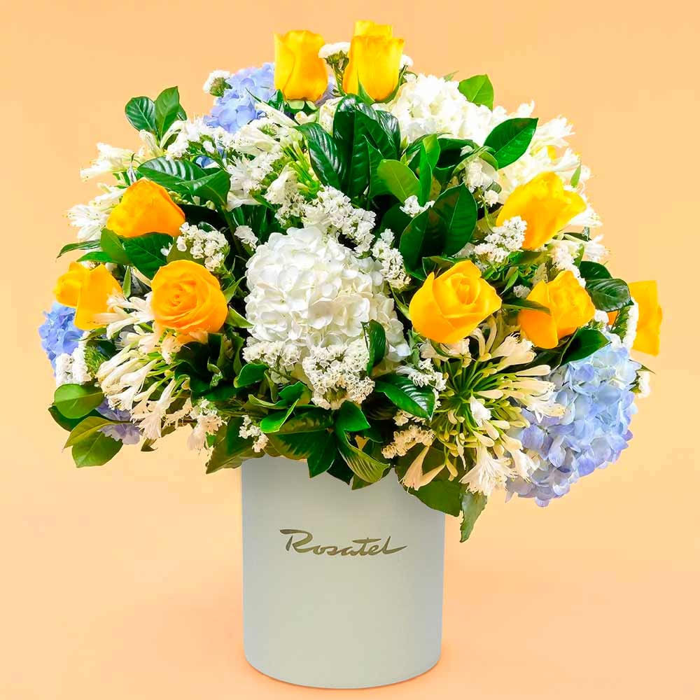 Espléndido arreglo floral en sombrerera (Circunferencia 18 cms. Alto 22 cms.) compuesta de la calidez de las 15 rosas amarillas, la suavidad de las hortensias y el encanto de las gardenias. El toque de statisce añade una textura única, creando una composición floral llena de vida y color.