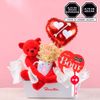 Adorable y encantador arreglo diseñado con nuestro tierno peluche amoroso rojo (19 cms. sentado), taza diseño te respeto, agradezco, admiro, te amo mamá, decorada con flores secas, caja corazón bom Rosatel con bombones de chocolate sabor avellana Cacaosuyo 8 unids. (Perú) y globo corazón 9".