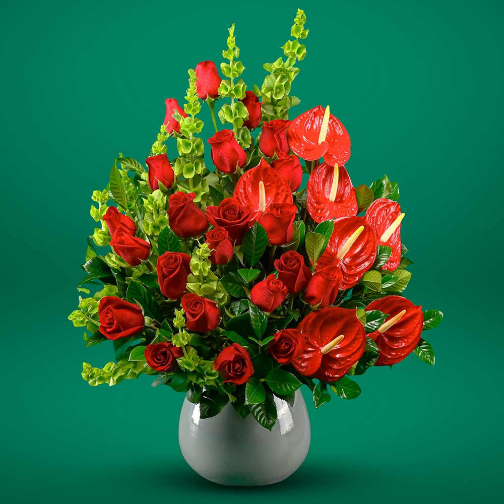 Este elegante arreglo floral, presentado en una sofisticada base de cerámica gris (18 cms.), combina la pasión y el refinamiento en una pieza deslumbrante. Consta de 18 majestuosas rosas rojas, que simbolizan el amor profundo, y 7 vibrantes anturios rojos, que añaden un toque exótico y distinguido. Complementado con un delicado follaje que realza la belleza natural de las flores. Este arreglo es perfecto para expresar emociones intensas y llenar de elegancia cualquier espacio.