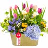 Sombrerera Rosada Mediana con 6 Tulipanes Hortensia y Flores