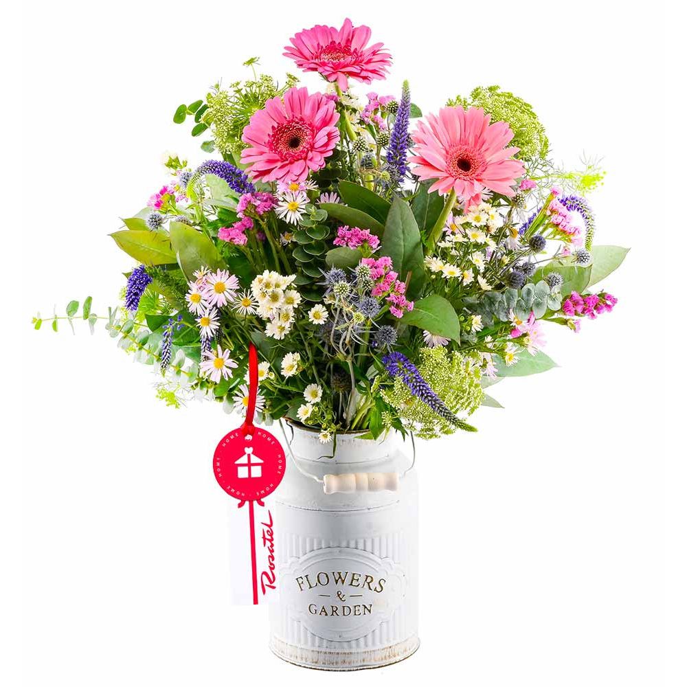 Arreglo vintage en colores suaves y delicados diseñado en base metálica blanca flowers & garden (21 cms.) con gerberas, flores y follaje variado.