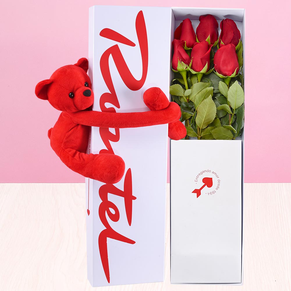 Caja 6 Rosas Rojas y Amoroso Rojo