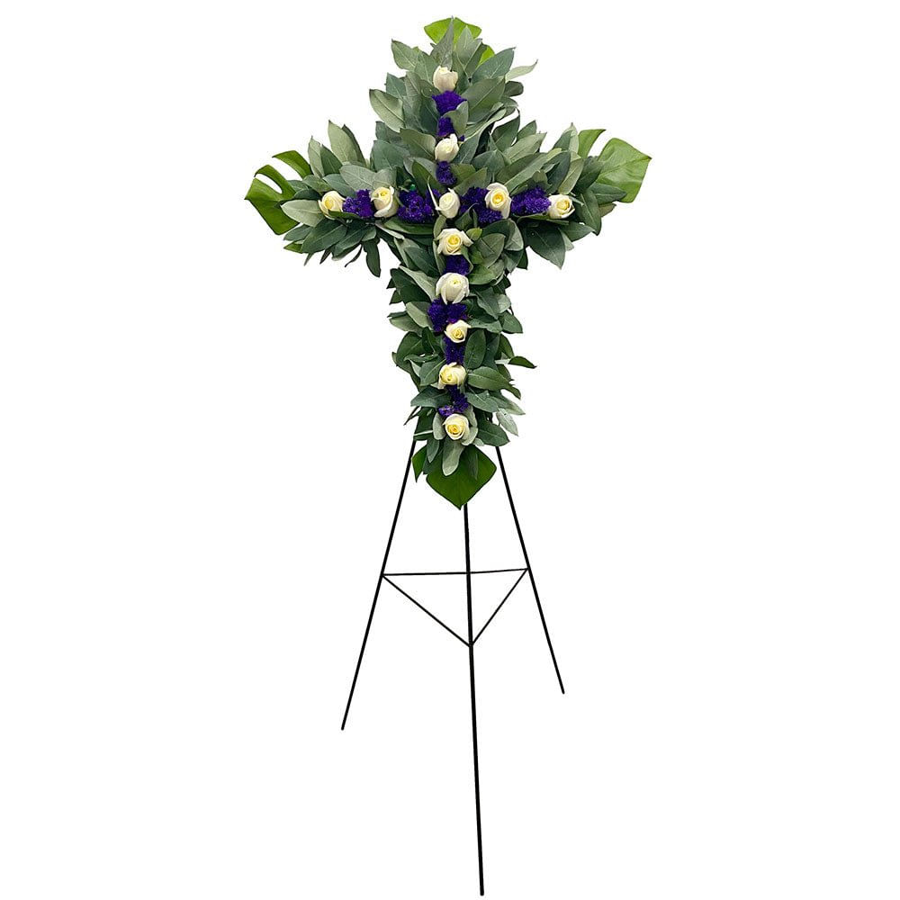 Cruz Pequeña con 12 Rosas, Pompos, Crisantemos y Flores en Trípode