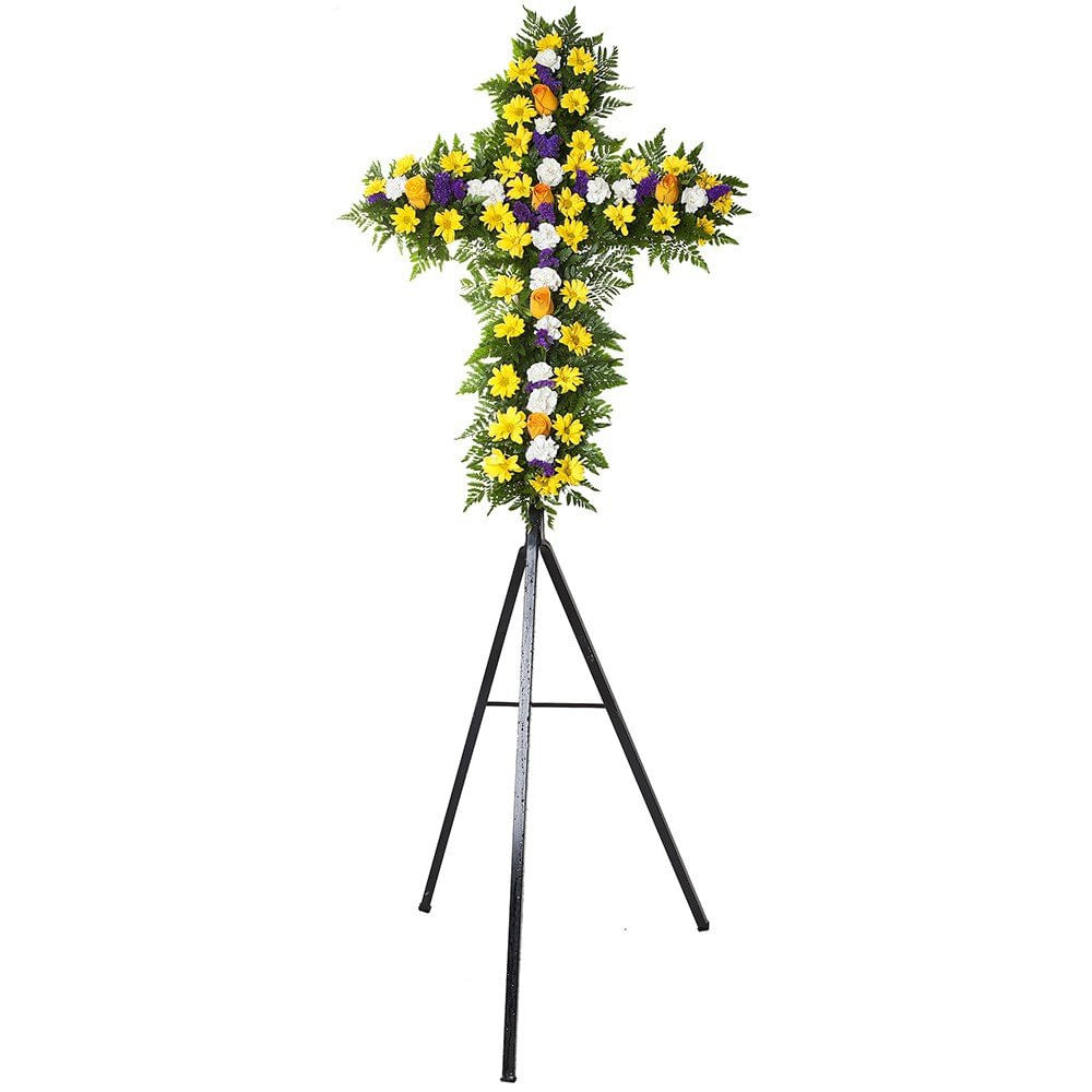 Cruz Pequeña con 12 Rosas, Pompos, Crisantemos y Flores en Trípode
