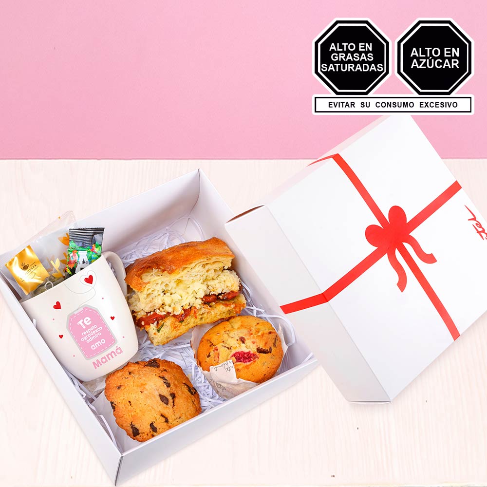 Pedidos con 48 horas de anticipación. Recepción de pedidos: Lunes a viernes de 8am a 2pm. No se reciben pedidos los días sábados, domingos ni feriados. Delicioso desayuno para engreír a mamá. Caja Rosatel: 1 focaccia capresse, muffin de fresas y chocolate, galleta chocochip, infusión, café soluble y taza de cerámica diseño te respeto, agradezco, admiro, amo, mamá.