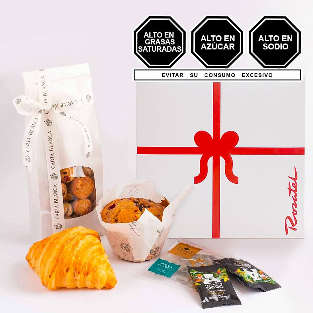 Pedidos con 48 horas de anticipación. Recepción de pedidos: Lunes a viernes de 8am a 2pm. No se reciben pedidos los días sábados, domingos ni feriados. Elegante caja blanca con 1 bolsa de mini galletas, 1 muffin de frutos rojos, 1 croissant, 1 infusión y 1 café instantáneo.