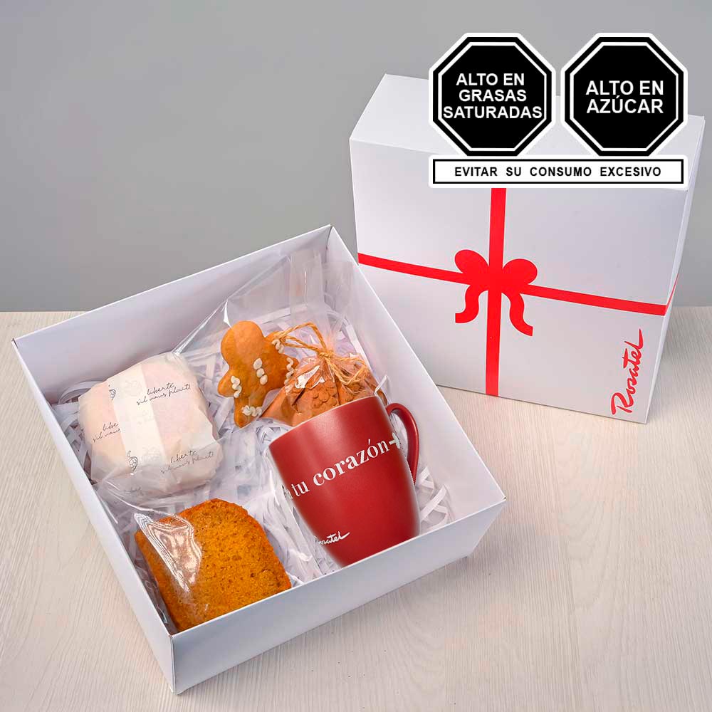 Disfruta la magia de la Navidad regalando desde la primera hora del día este delicioso desayuno navideño en caja incluye un sándwich de pavo con salsa navideña en english muffin, mezcla para preparar un delicioso chocolate caliente, una galleta de muñequito de jengibre, una porción de keke de camote con frosting de canela y taza de cerámica roja diseño directo a tu corazón Rosatel. Un regalo cálido, original y perfecto para sorprender con el espíritu navideño.