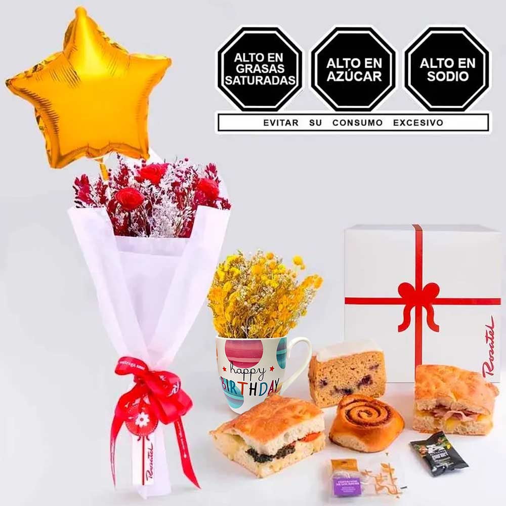 Desayuno delicias al despertar. Elegante caja con: 1 sándwich mixto en pan focaccia, 1 sándwich capresse en pan focaccia, 1 cinnamon roll, 1 porción de queque de limón con arándanos, 1 infusión, 1 café instantáneo y taza de cerámica con diseño happy birthday y mensaje por un año lleno de amor y felicidad decorada con flores secas como detalle acompañado con ramo Línea Rosatel Forever diseñado con flores secas, rosas artesanales rojas, jaspia seca roja y blanca, arrocito color natural y linaza roja envuelto delicadamente con cinta y globo estrella 18" colores variados.