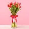 Nuestros arreglos florales con tulipanes en delicado florero de vidrio (30 cms. alto), son 10 tulipanes rojos complementados con follaje, listo para sorprender a tu persona favorita.