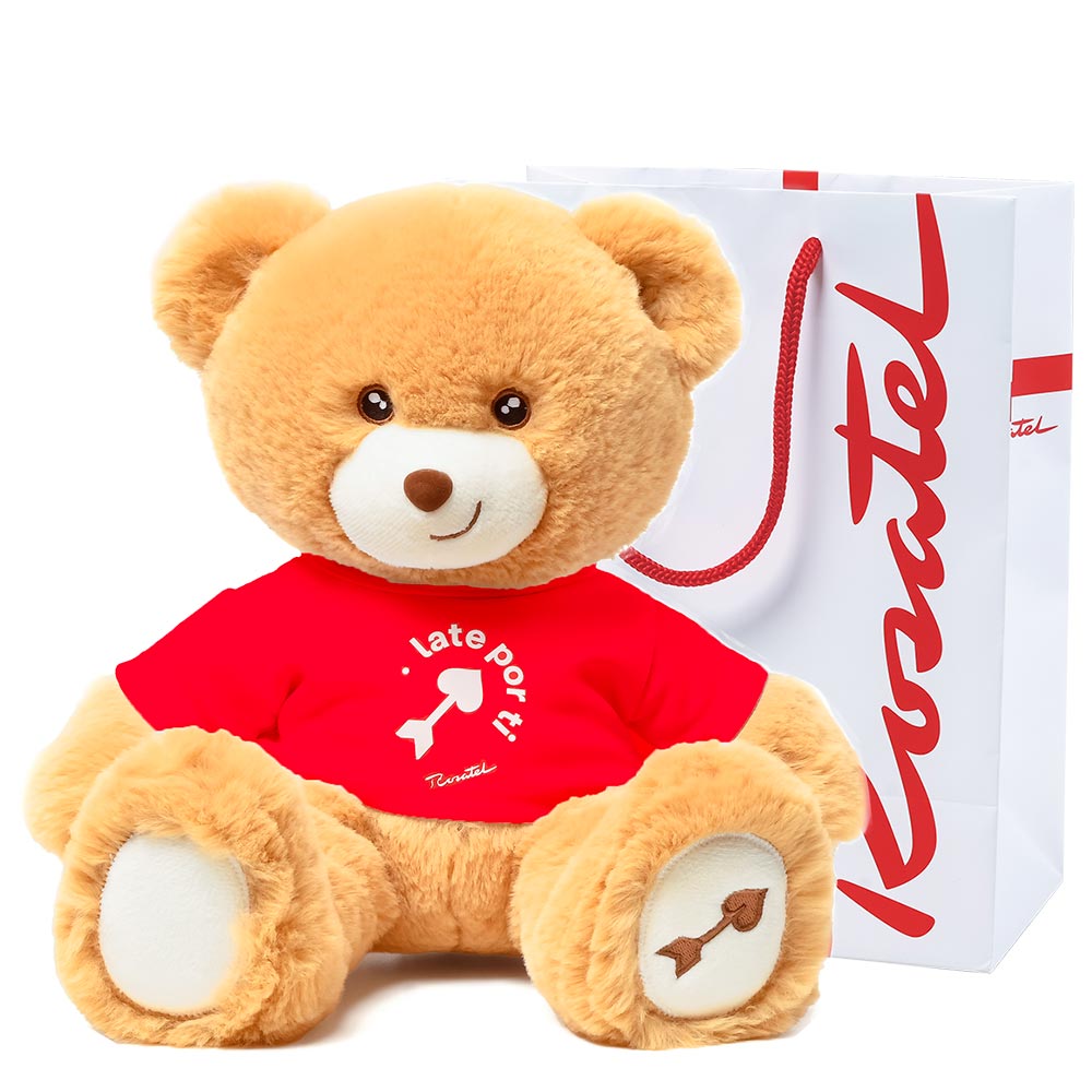 Peluche Hugo mediano (35 cms.) con polo rojo diseño flecha corazón late por ti en bolsa Rosatel.
