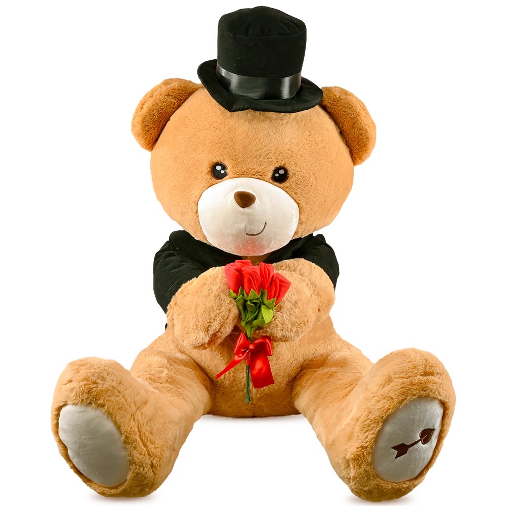 Hugo gigante (1 mt. aprox.) vestido con elegante y romántico traje smoking color negro, lindo sombrero y ramo de rosas rojas (hechas de tela) en empaque Rosatel.