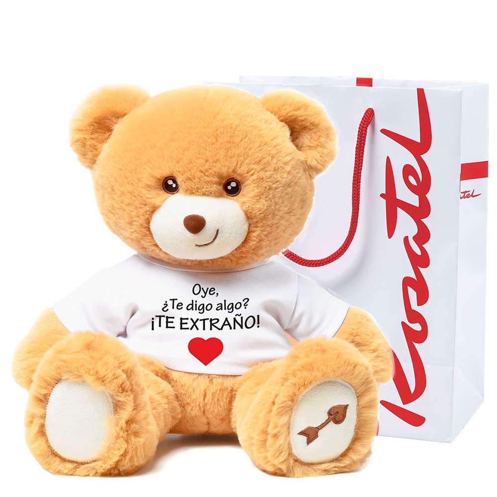 Tierno oso de peluche Hugo mediano (35 cms.) está listo para abrazar y decir te extraño con polo diseño Oye, ¿te digo algo? ¡Te extraño! en bolsa Rosatel.