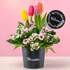Sombrerera Negra Mediana con 6 Tulipanes y Girasoles