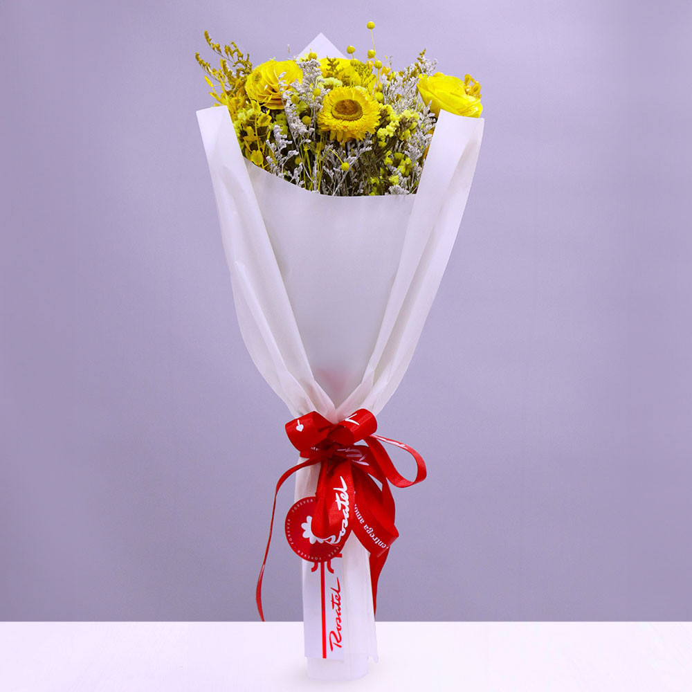 Ramo de flores secas con rosas artesanales color amarillo, estatis seco amarillo, jaspia seco blanca, lentejitas amarillas, linaza amarilla y papelillo envuelto delicadamente con cinta decorativa.