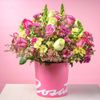 Este exquisito arreglo floral destaca por su base rosada, que sirve de lienzo para un deslumbrante despliegue de rosas en tonalidades lilas, rosadas y verdes. Combinación armoniosa y vibrante, se completa con una variedad de flores que añaden textura y riqueza visual, mientras que el follaje fresco y exuberante proporciona un toque de elegancia y naturalidad. Ideal para ocasiones especiales o para añadir un toque de sofisticación y frescura a cualquier espacio, este arreglo es una celebración de color y belleza en su máxima expresión.