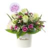 Sombrerera crema mediana (15 cms.) con 5 rosas verdes, flores y varilla acrílica felicidades es una niña.
