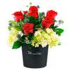 Sombrerera negra mediana (15 cms.) con 6 rosas rojas, hortensias y follaje variado.